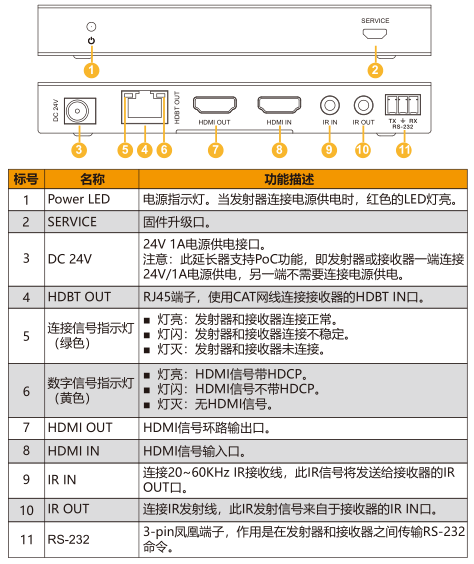 输入:1×HDBT IN [RJ45, 8-pin母口] 1×SERVICE [Mini-USB, 升级口]; |