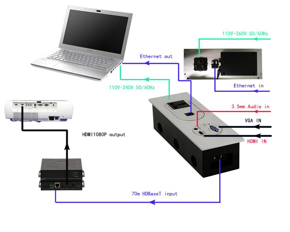 对于高清信号可实现拨码开关调整视频分辨率,多接口视频信号可在桌插上切换按钮来选择信号切换。